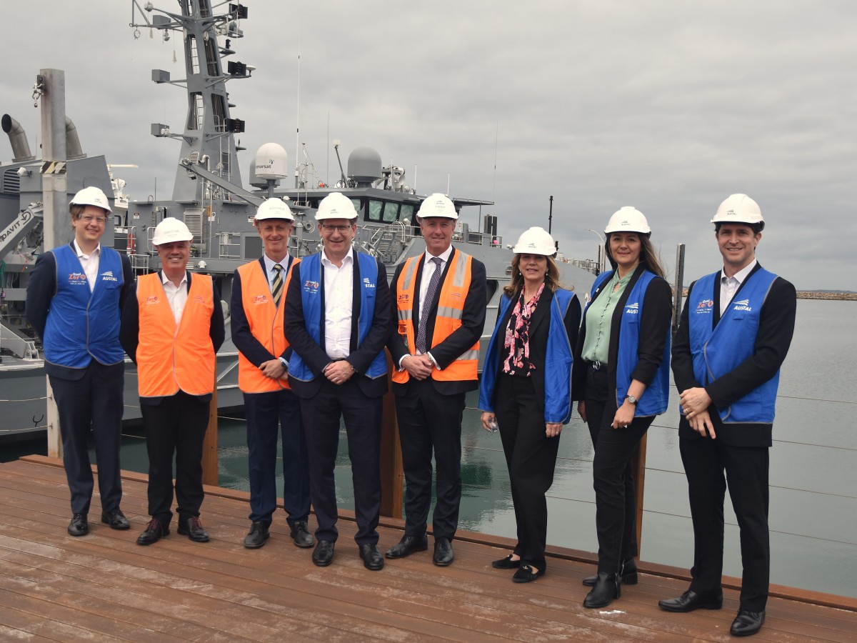 Export Finance Australia (EFA) and Austal Limited signed a US$100 million loan agreement at the Henderson shipyard in Western Australia today, to enhance Austal’s construction of vessels for the US Navy and US Coast Guard at the Company’s Mobile, Alabama Shipyard. On site in Henderson were, from left; Jon Denniss, Senior Legal Counsel EFA; Christian Johnstone, Chief Financial Officer, Austal; Matthew Egan, Treasurer, Austal; John Hopkins, Managing Director and CEO EFA; Paddy Gregg, CEO Austal Limited; Philippa King, Chief People and Corporate Affairs Officer; Aleks Henderson, State Director (WA), EFA; Dan Smart, General Manager EFA. (Image: Austal Limited)