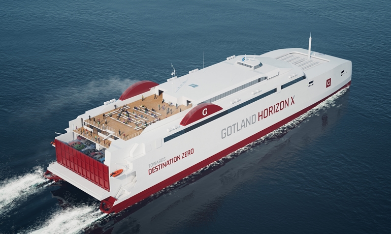 ‘Gotland Horizon X’ is a 130 metre long high-speed catamaran that will be able to operate on hydrogen and other fossil free fuels and will be used in the traffic between the Swedish mainland and the island of Gotland; transporting 1,650 passengers and 450 vehicles at speeds up to 35 knots.
