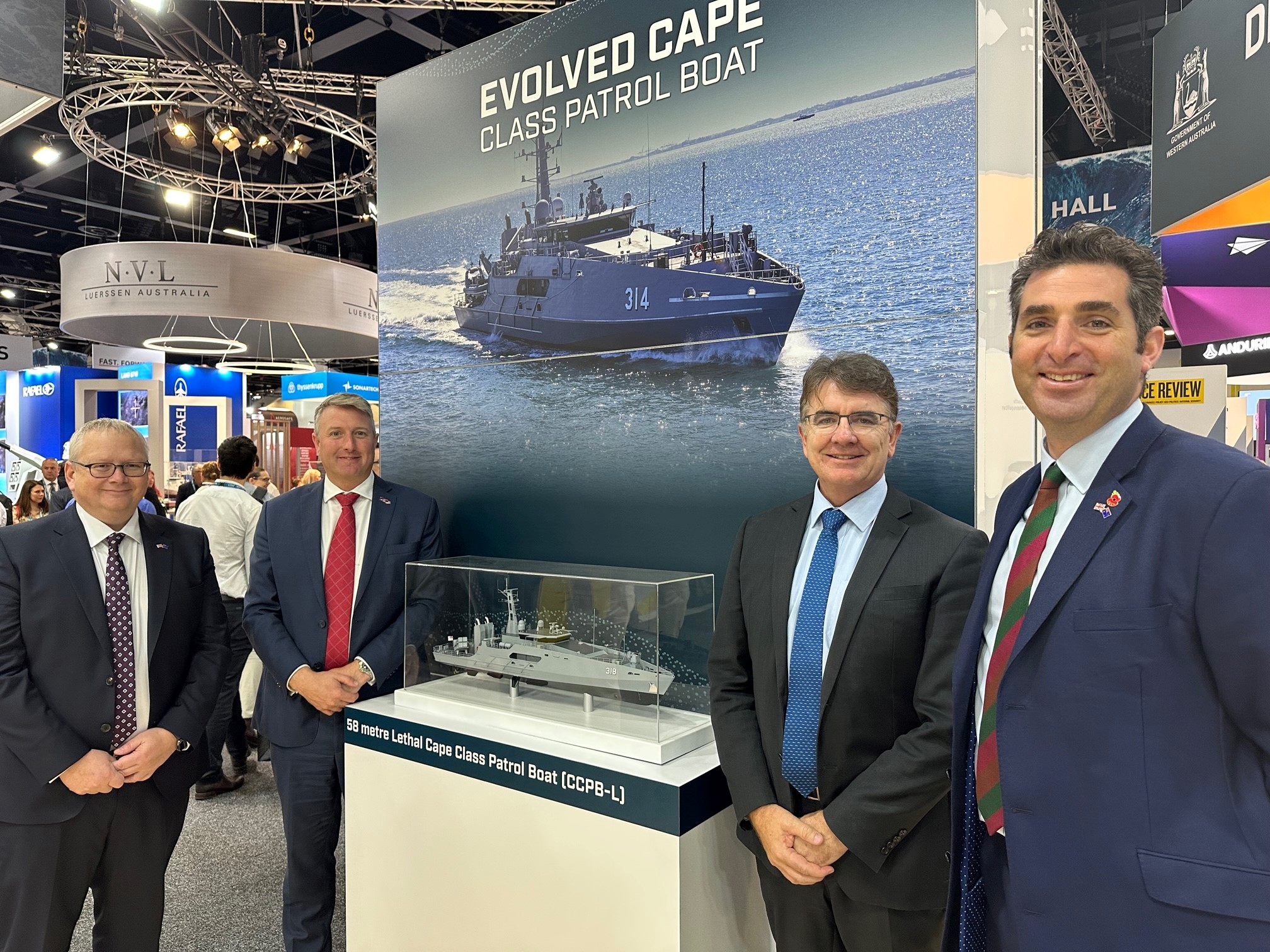 Austal Limited Chief Executive Officer Paddy Gregg and Austal Australia Chief Operating Officer Ian McMillan met with John Wood, Group Chief Executive Officer and Oliver Morton, Chief Sales Officer from Harland & Wolff at the 2023 Indo Pacific Maritime Exposition in Sydney to confirm an MOU to pursue shipbuilding opportunities in the United Kingdom. (Photo: Austal)
