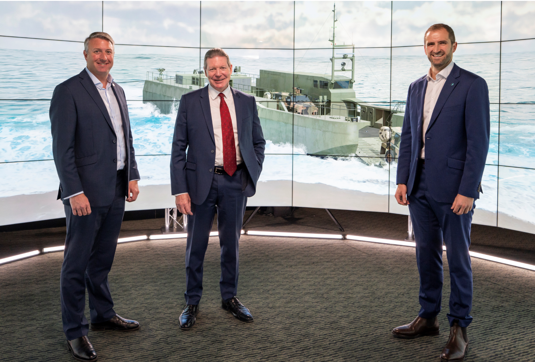 From left: Austal Limited CEO Paddy Gregg, Raytheon Australia Managing Director Michael Ward, and BMT Senior Business development Manager Trevor Dove at Raytheon Australia’s ‘CAVE’ at Headquarters in Canberra, Australia (Image: Raytheon Australia)