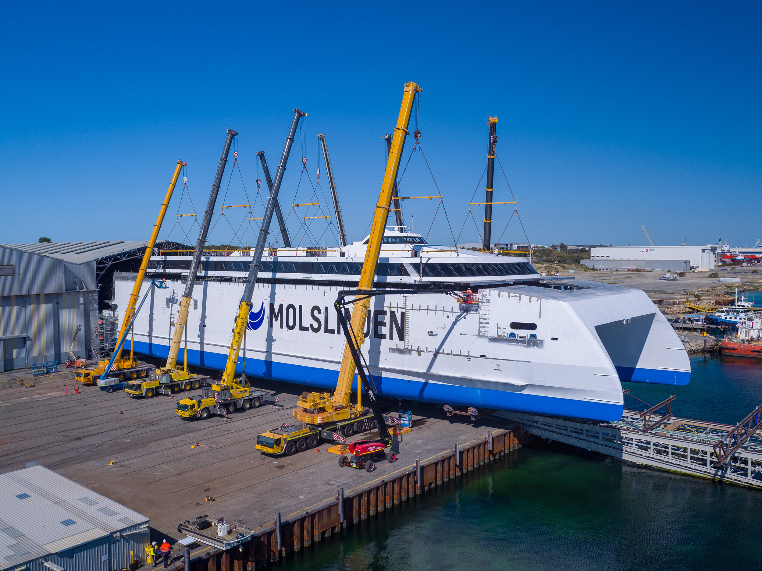 AUSTAL (ASX:ASB) today celebrated the successful roll out of the Auto Express 109 metre high speed vehicle / passenger catamaran ferry ‘Express 4’ for Molslinjen (OMX:MOLS) of Denmark. The milestone involved the hull and superstructure leaving the construction halls, followed by the superstructure being lifted and joined to the hull. The vessel is now undergoing final fit out and will commence sea trials shortly.