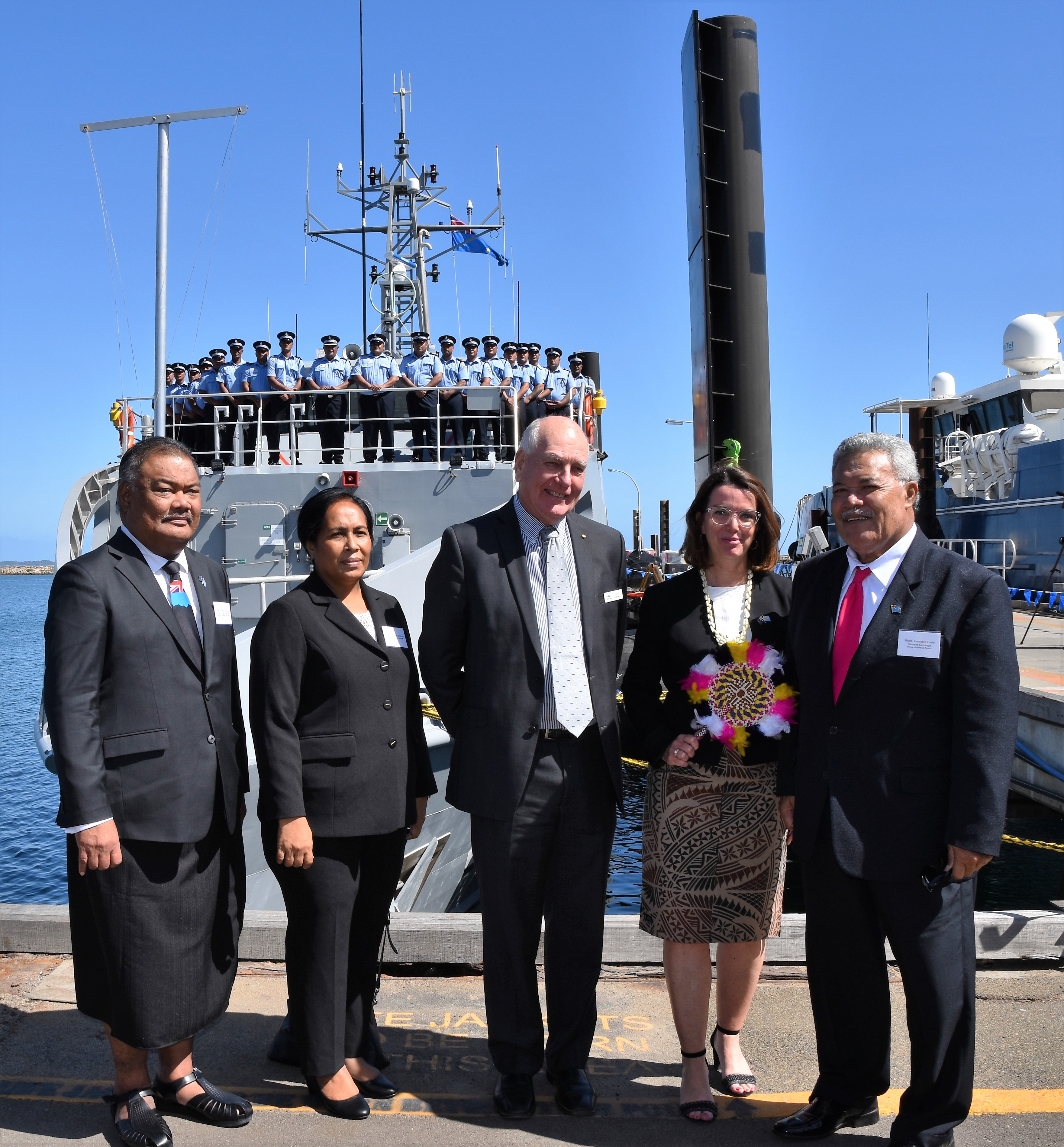 Prime Minister The Hon Enele Sopoaga accepts the Te Mataili II from the Commonwealth of Australia, represented by Senator Anne Ruston, Assistant Minister for International Development and the Pacific. Tuvalu's Minister for Natural Resources, The Hon Dr Puakena Boreham and Minister for Foreign Affairs, Trade, Tourism, Environment and Labour, The Hon Taukelina Finikaso joined the Prime Minister at the ceremony. (Image: Austal)
