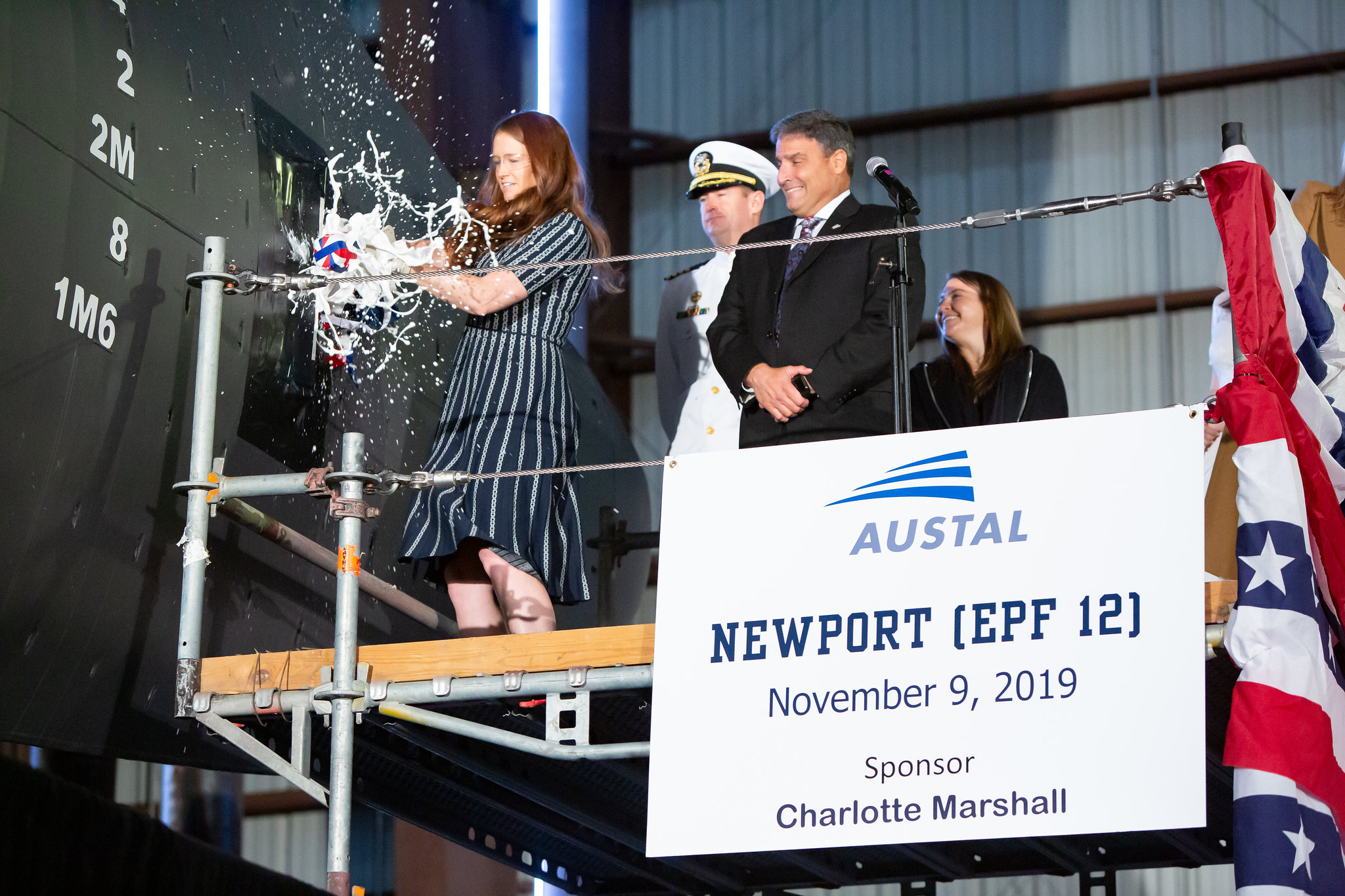 The future USNS Newport was officially christened by ship sponsor, Charlotte Marshall and was named after Newport, Rhode Island - home to U.S. Naval Station Newport and the Naval War College.