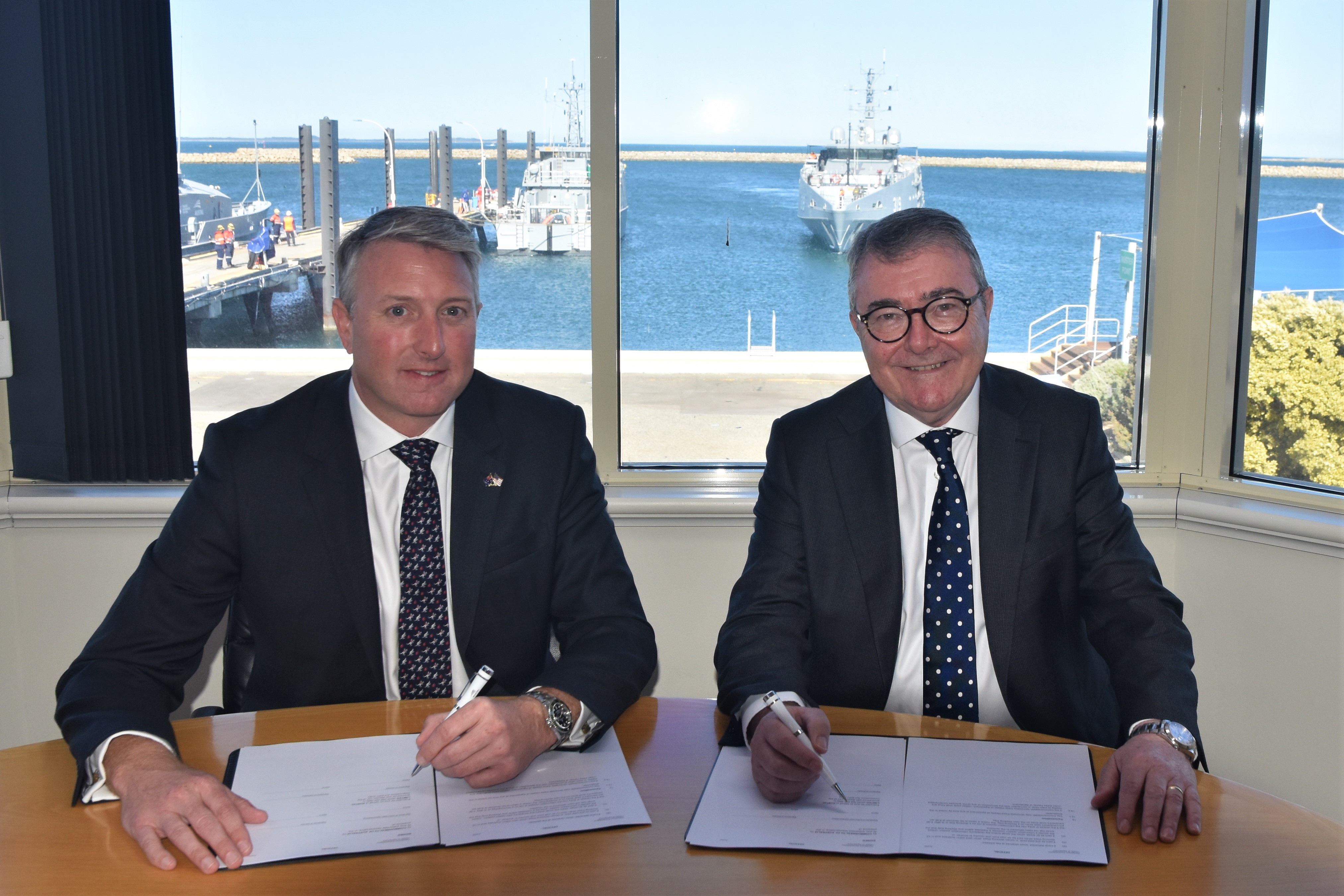 Austal Limited CEO Paddy Gregg (Left) and Deputy Secretary, Naval Shipbuilding and Sustainment, Australian Department of Defence, Jim McDowell signing the Heads of Agreement at Austal's Henderson Western Australia headquarters 23 November 2023 (Image: Austal)