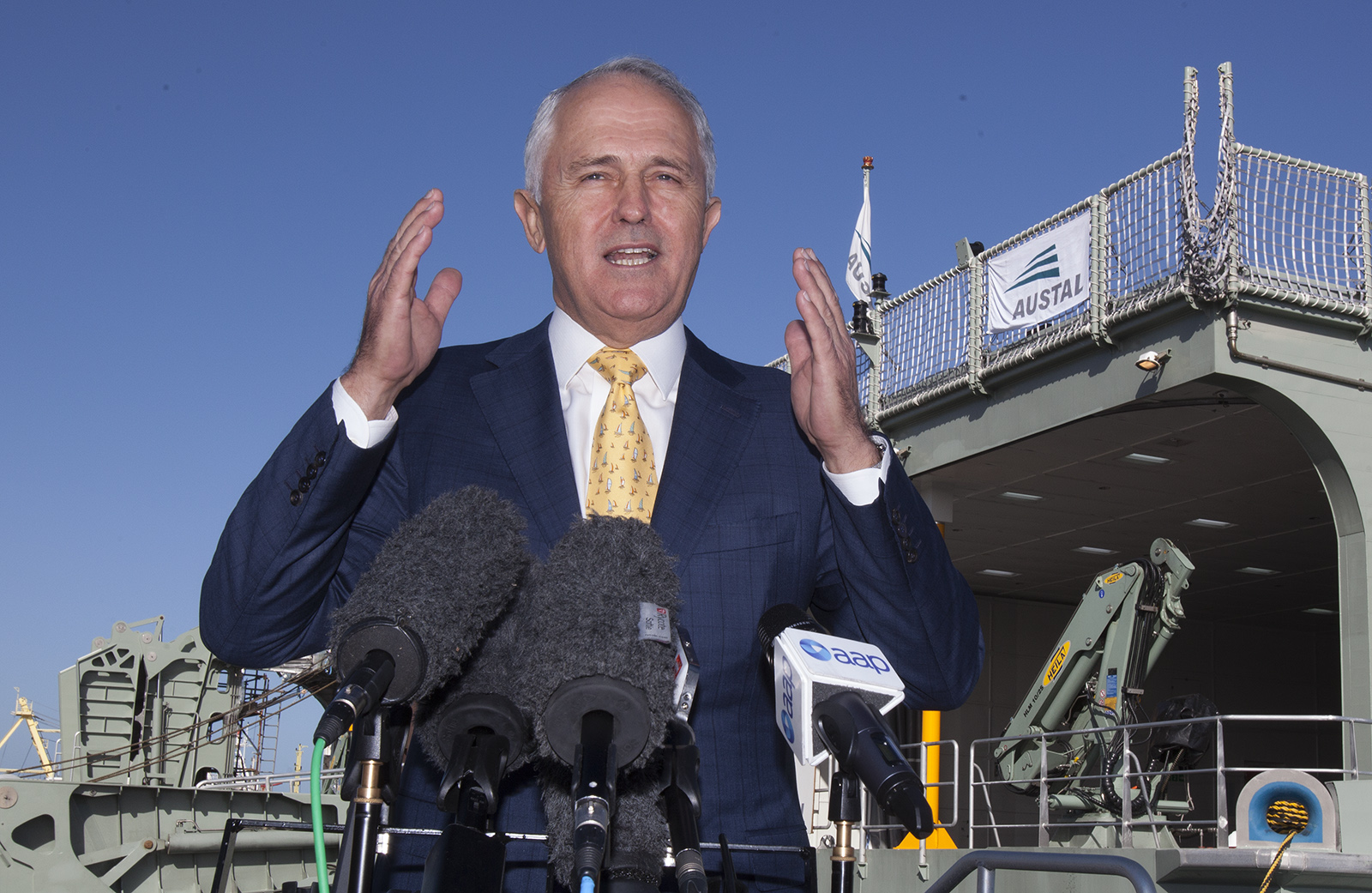Prime Minister Malcolm Turnbull in front of the 72m (offshore patrol vessel sized) High Speed Support Vessel - designed and constructed for the Royal Navy of Oman by Austal. (Image: Rod Taylor/Austal)
